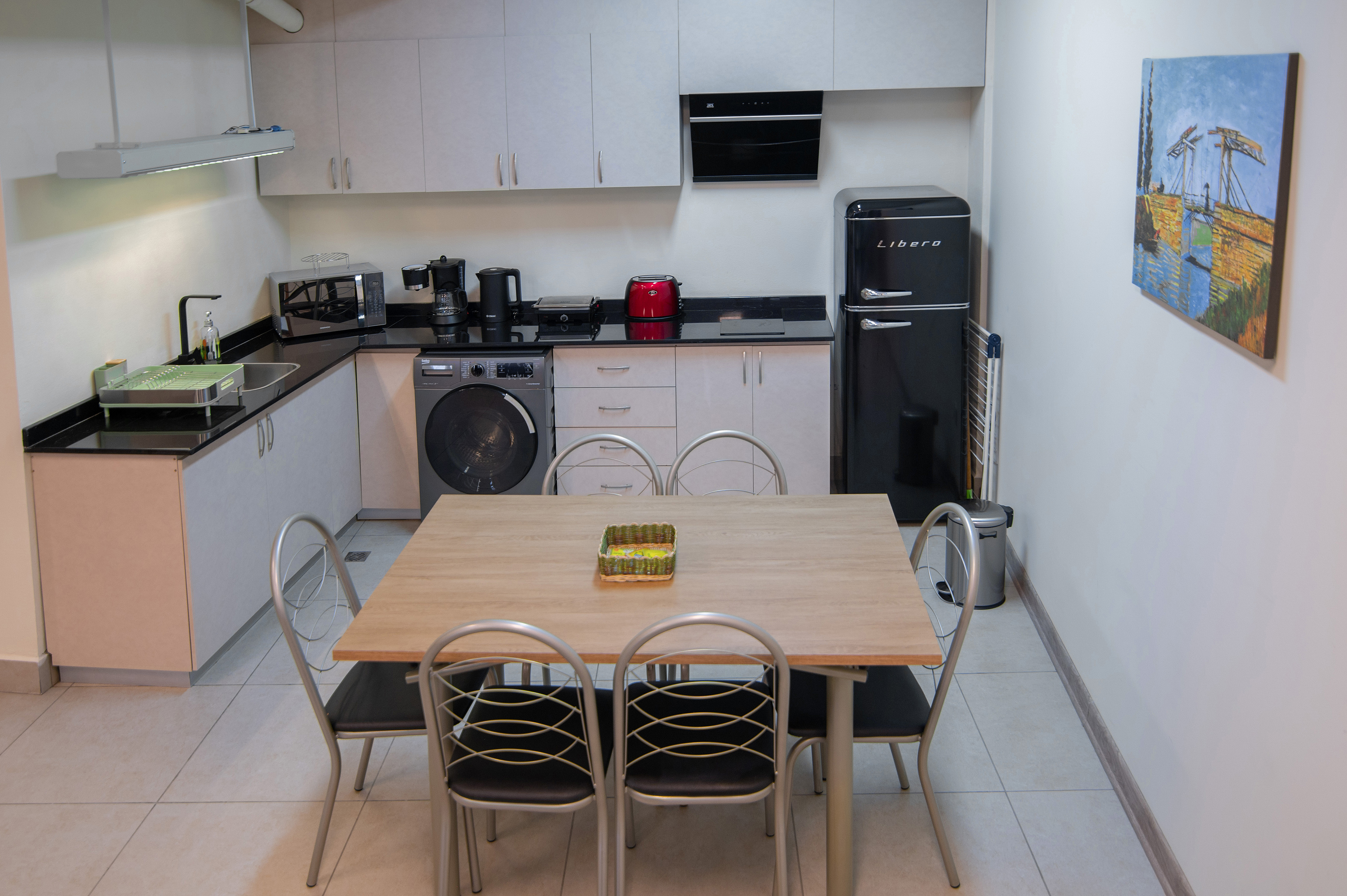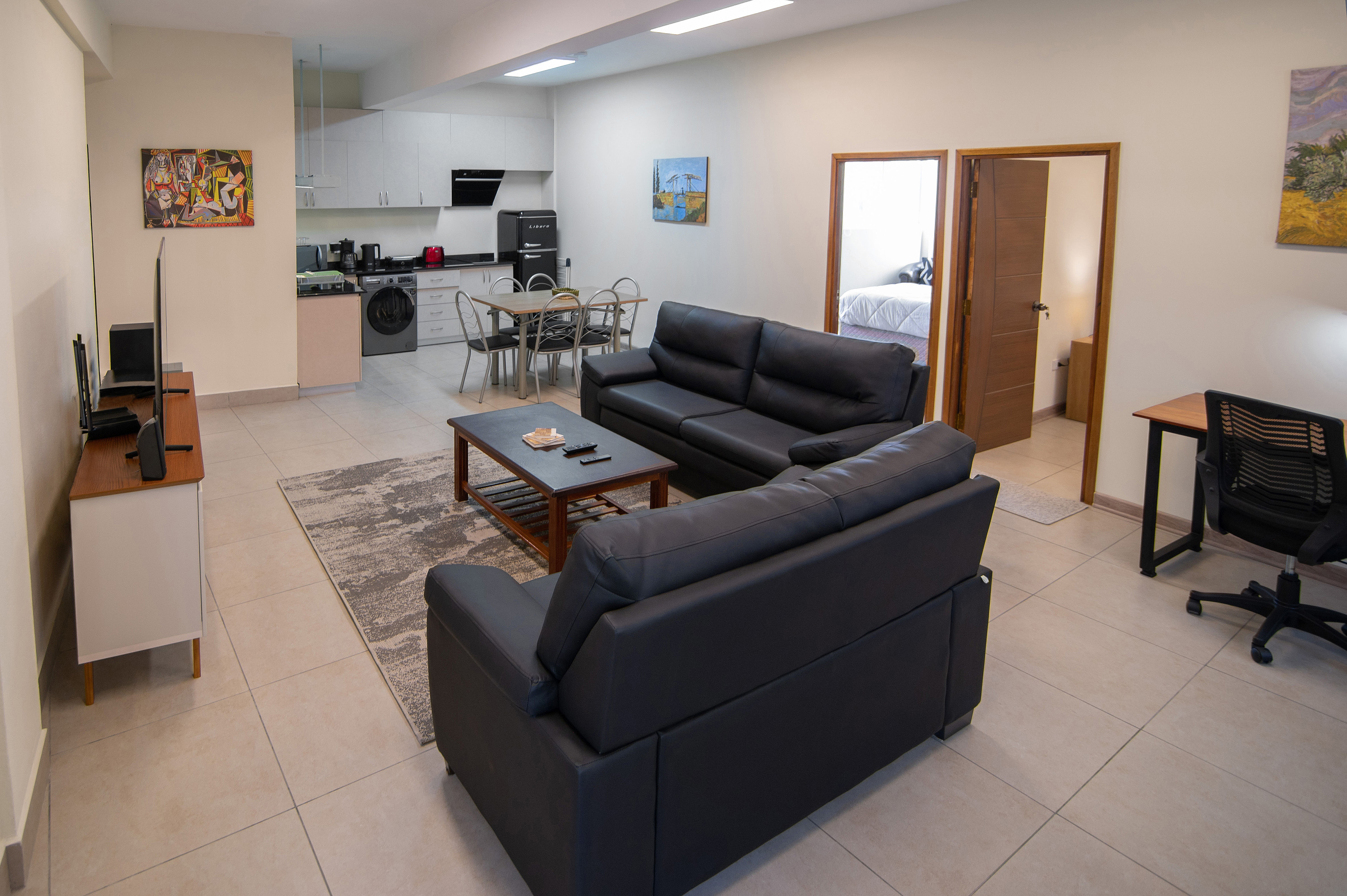 El estar de los apartamentos cuenta con Wifi Gratis, televisión con aplicaciones, cocina con utensilios y café incluido. Los baños, todos, con duchas escocesas.